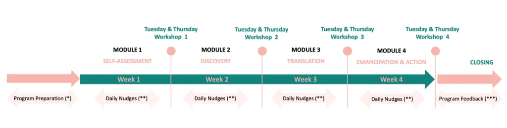 (**) Daily nudges: Expect a daily dose of engaging content and bite-sized activities sent directly to your inbox, designed to prepare you for the upcoming weekly workshop